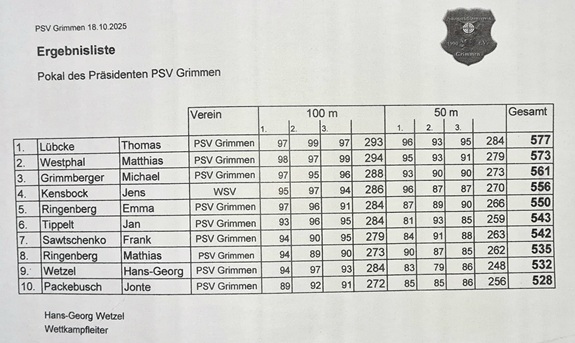 Am 18.10.2025 fand der jährliche Pokal des Präsidenten, Marco Jahns, statt. Wiederholt fanden sich, gegen 09:00 Uhr, 10 Schützen auf dem Gelände des PSV Grimmen ein.