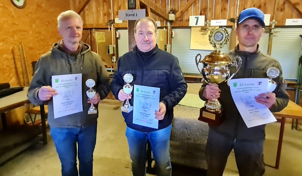 Keiner hat größere Schwächen gezeigt und die Endergebnisse unterschieden sich, vom Ersten bis zum Zehnten nur um 49 Ringe. Der Vorjahressieger, Mathias Westphal, hatte mit nur 4 Ringen Abstand das Nachsehen gegenüber Thomas Lübcke. Die Drei Besten erhielten einen Pokal und der Pokalsieger zusätzlich den Wanderpokal. Auch wenn es ein langer kalter Wettkampftag war, Siegerehrung gegen 13:30 Uhr, war keiner gestresst. Schließlich konnten alle ihre Ergebnisse in die Wertung der Vereinsmeisterschaft einfließen lassen. Also, zwei Fliegen mit einer Klappe geschlagen.