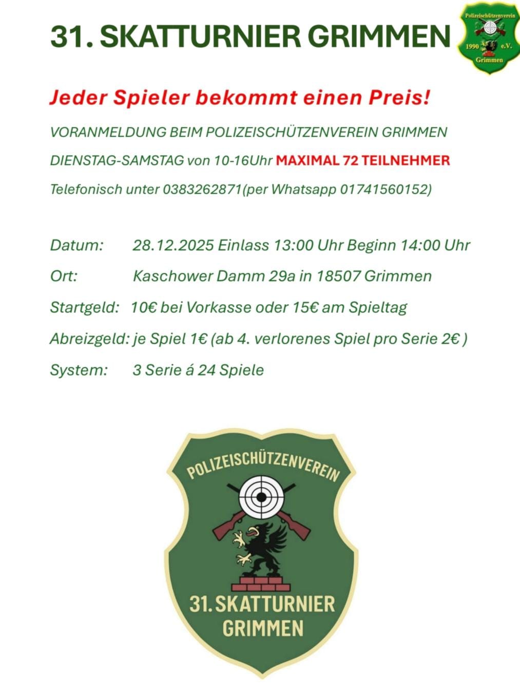 Wie jedes Jahr findet auch diesmal am Jahresende ein großes Skatturnier beim PSV statt. Jeder Spieler erhält einen Preis. Einlass ist um 13:00 Uhr. Beginn ist 14:00 Uhr. Startgeld beträgt 10 Euro. Für das leibliche und spirituelle Wohl wird gesorgt. Auch diesmal gibt es wieder für JEDEN einen Preis. Also wer bis jetzt noch nicht angemeldet ist, direkt bei Björn, […]