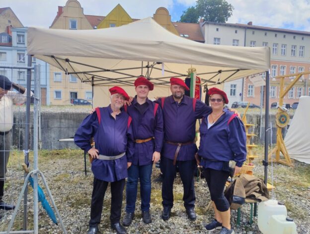 4 Bogenschützen aus Grimmen waren im Lager des Stralsunder Traditionsverein e.V. und Stralsunder Schützen-Compagnie 1451 e.V. als Helfer und Mitwirkende. Hier haben wir den Besuchern, Einheimischen und Touristen aus Deutschland, England und Schweden ermöglicht, mal unter Anleitung Bogen zu schießen. Von 10 Uhr bis 18:00 Uhr war doch reger Betrieb. Von 5 Jahre alten Kindern bis zum 70 jährigen Mann, war alles vertreten. Als ein Höhepunkt durften wir als Rekruten am Freitag mit der Stralsunder Stadtwache marschieren. Jeder bekam eine Jacke und ein Barett. Und als i Tüpfelchen eine Hellebarde. So liefen wir mit im Festumzug vom alten Markt bis zu der Hansa Wiese. Dort gab es zum Glück vor der Ansprache der Ratsherren freie Getränke. Die Stadtwache gab am Sund noch einen Kanonenschuß ab und es wurde Salut geschossen. Hier konnten wir unsere Hellebarden einsetzen, um die Zuschauer auf Abstand zu halten. Aber dies klingt hier natürlich schlimmer, als es wirklich war. Bilder und Videos von den Wallensteintagen auf bogensport-grimmen und youtube.