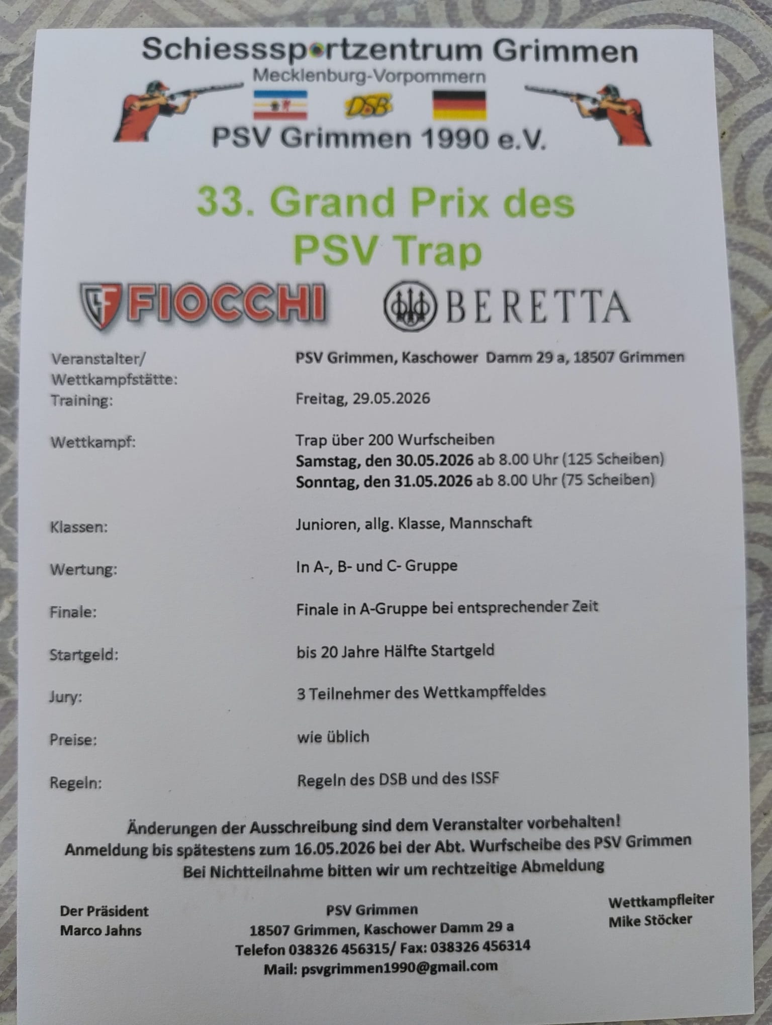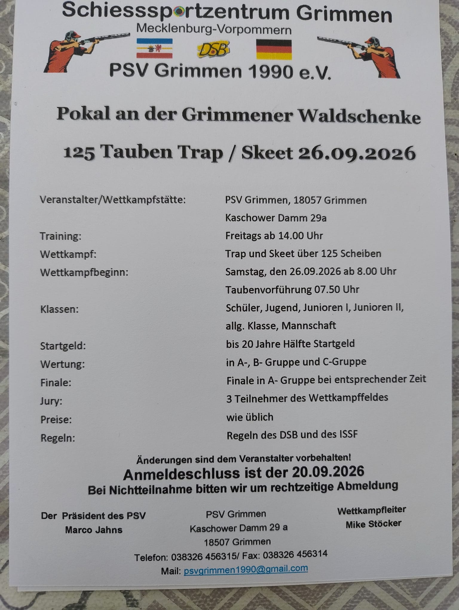 Protokoll_1_WK_Pokal_des_PSV_Grimmen_2026.pdf Ausschreibung-Pokalwettkaempfe-DL-2026.pdf Anlage-1-Anmeldung zur-Ausschreibung-Pokalwettkaempfe-DL-2026.pdf Anlage-1-Anmeldung-zur-Ausschreibung-Pokalwettkaempfe-DL-2026.docx Anlage-2-Einteilung-Klasse-und-Alter-zur-Ausschreibung-Pokalwettkaempfe-DL-2026.pdf Der Polizeischützenverein Grimmen lädt alle Freunde des Druckluftschießens zu den diesjährigen und 13. Pokalwettkämpfen ein. Wettbewerbe Luftgewehr 1.10, Luftgewehr Auflage 1.11, Luftpistole 2.10 und Luftpistole Auflage 2.11 auf der Grundlage der Sportordnung des DSB. Termine/Meldeschluss Wettkampfort Termin Meldeschluss Wettkampf Grimmen 08.+09.11.2025 25.10.2025 Wettkampf […]
